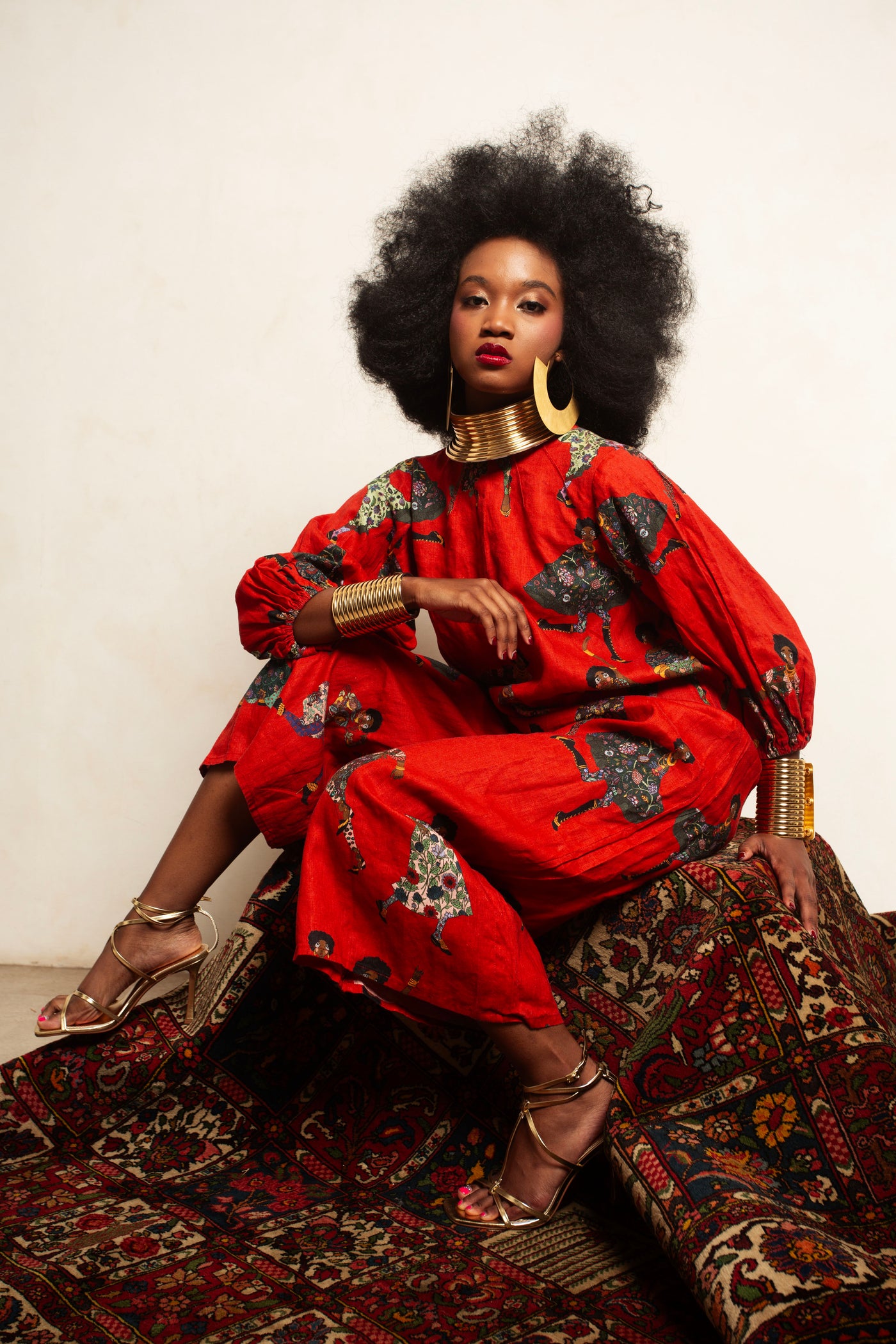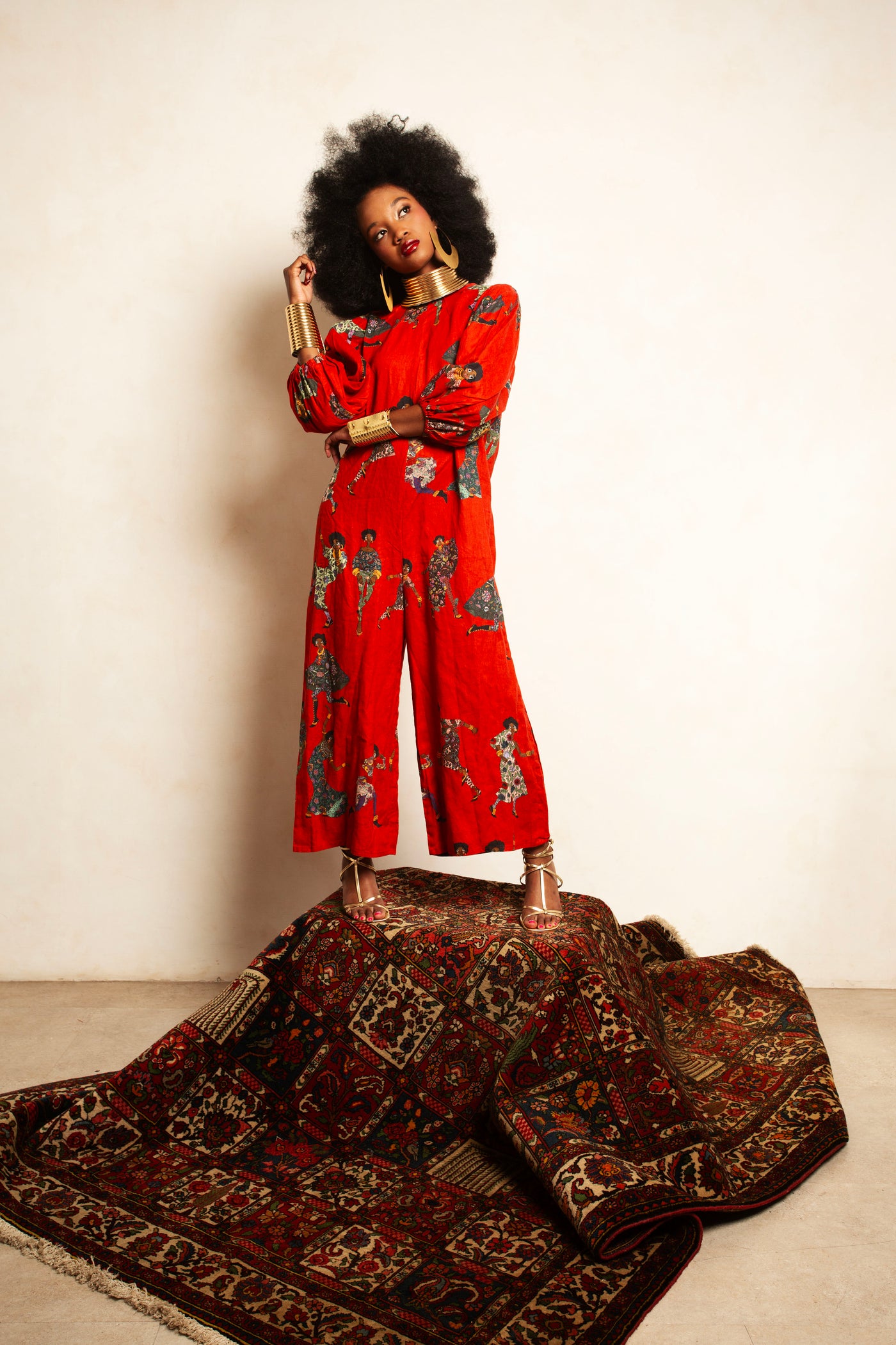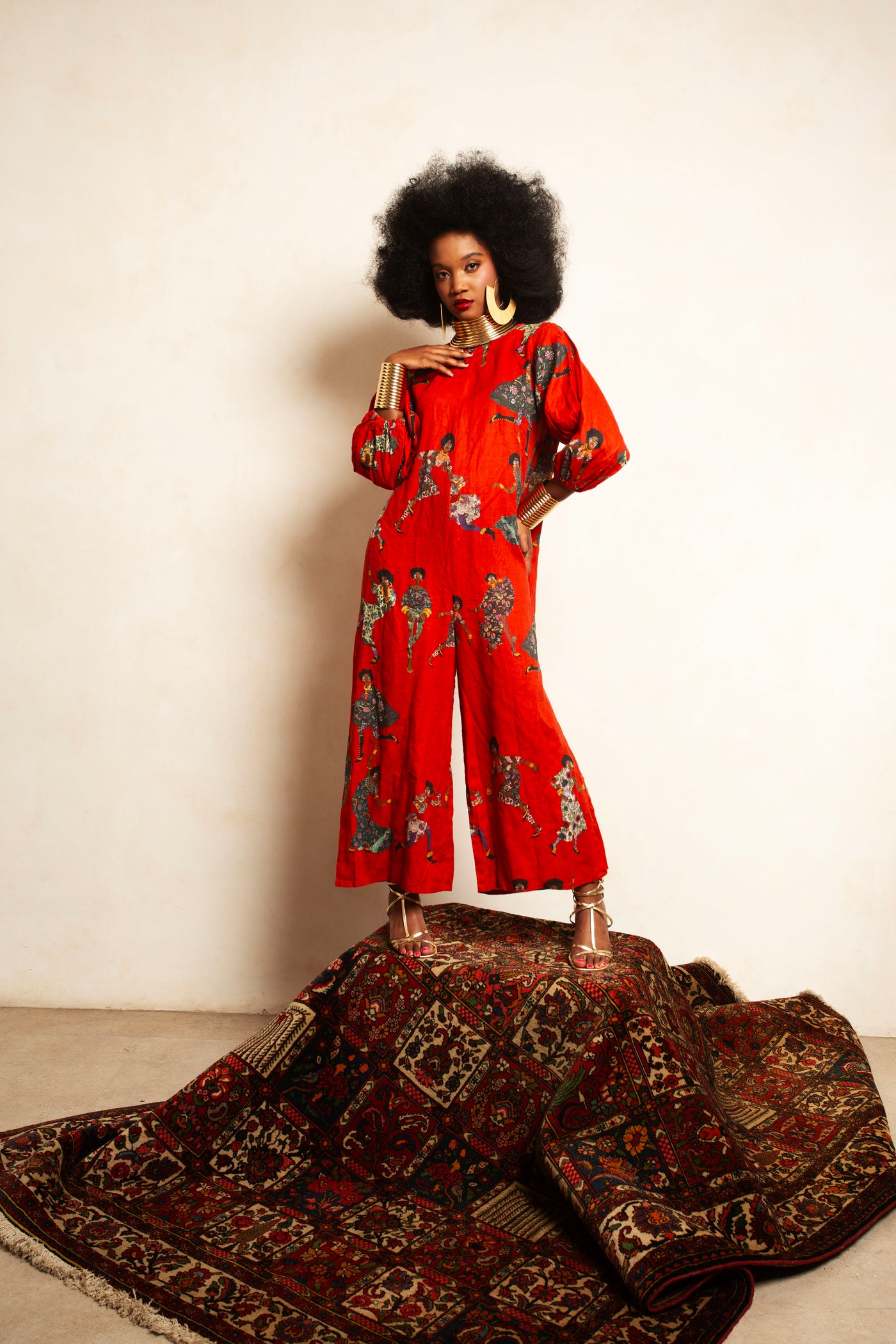 The Lady Anele Jumpsuit is a modern statement piece with a relaxed yet tailored silhouette. Featuring voluminous puffy sleeves paired with a loose waistline and fluid wide-leg trousers, it strikes the perfect balance between drama and effortless elegance. Versatile and timeless, it transitions seamlessly from day to night with sophisticated ease.