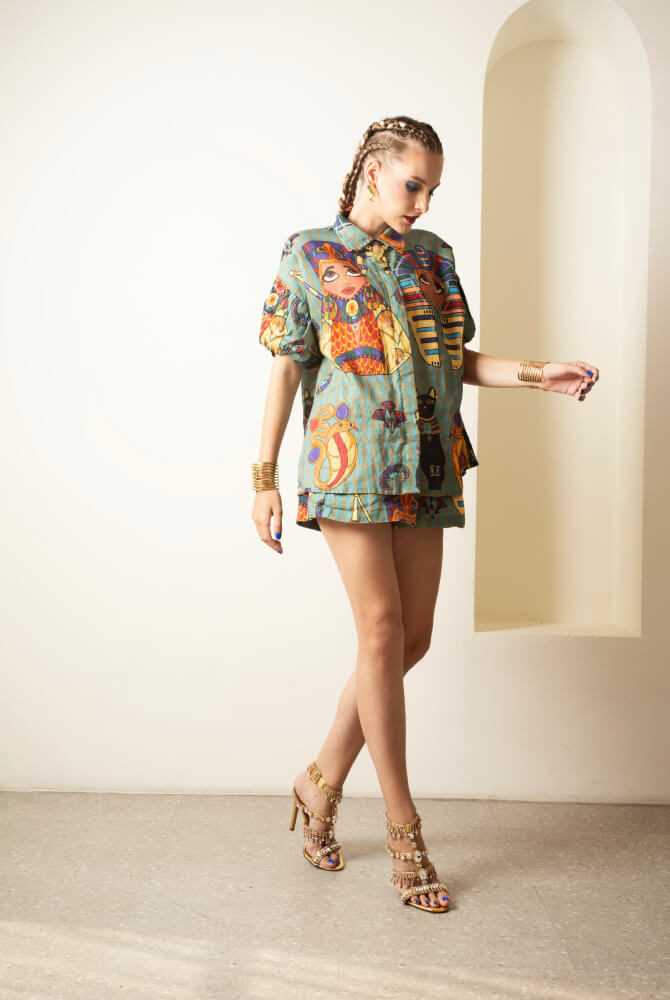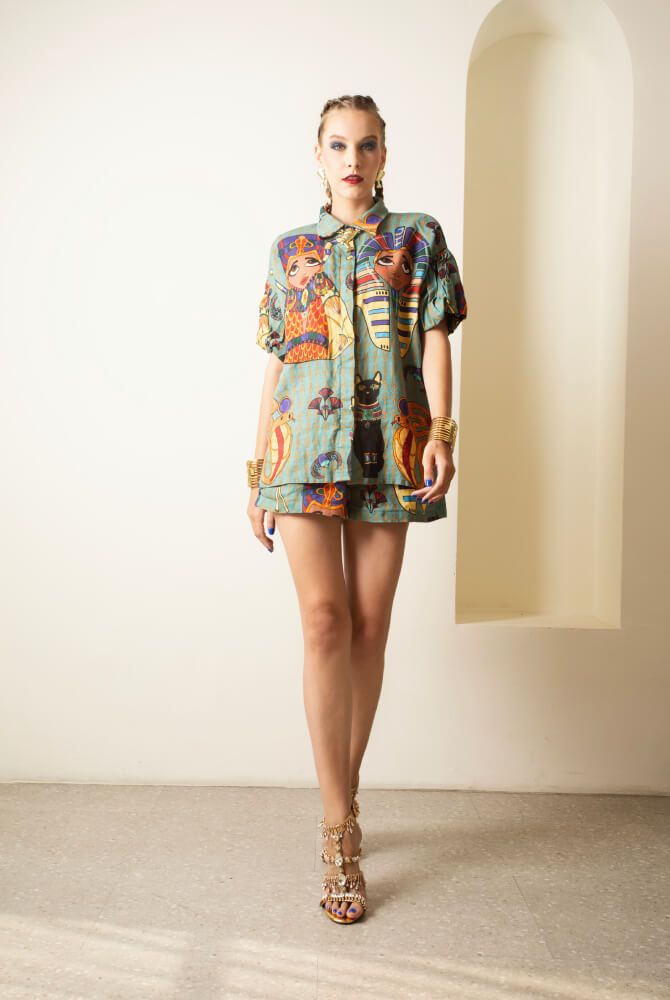 A refined yet expressive piece from the Queen Nefertiti collection, the Lady Sade Linen Collared Shirt is crafted from 100% linen for breathable, effortless wear. Featuring a relaxed silhouette with a classic collar and soft short sleeves, this shirt allows the hand-illustrated artwork to take centre stage. Designed to be worn as a statement on its own or styled as a set, it balances timeless tailoring with artistic storytelling.