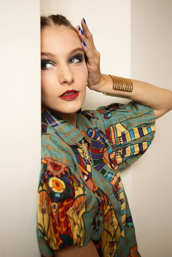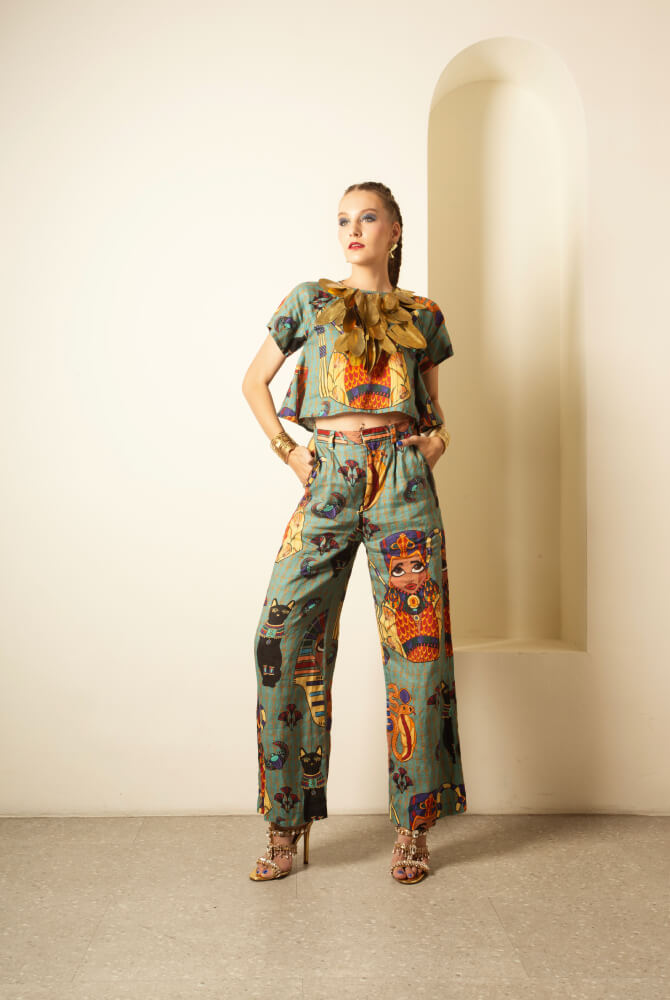 A confident expression from the Queen Nefertiti collection, the Lady Zuri Top is designed to celebrate bold femininity through art and form. Featuring a cropped silhouette with soft sleeves, this piece highlights the hand-illustrated goddess artwork while offering effortless structure and movement. Designed to be styled as a statement on its own or paired with matching separates, it embodies strength, confidence, and modern elegance.