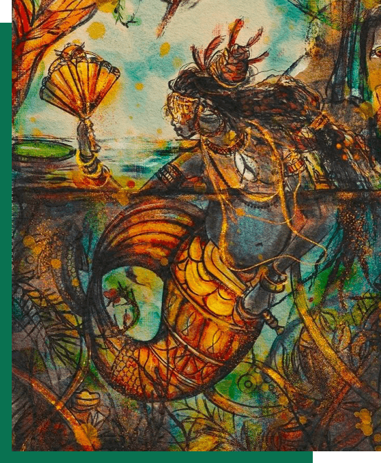 Mami Wata, dont le nom signifie « Mère Eau », est vénérée dans toutes les cultures comme une déesse de la mer. Connue pour sa dualité – douce mais féroce, nourricière mais autoritaire – elle incarne les complexités de la féminité. Son histoire incite les femmes à accepter leurs propres contradictions, à trouver du pouvoir dans leur vulnérabilité et de la beauté dans leur force.