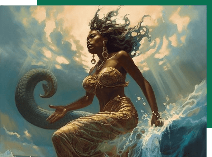 En tant que déesse, Mami Wata est souvent représentée comme une sirène ou un esprit de l'eau, commandant les marées avec grâce et autorité. Son image rappelle que la liberté est un droit de naissance pour la femme, et son essence encourage toutes les femmes à relever les défis de la vie tout en traçant leur propre chemin.